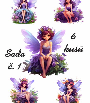 Fialové zahradní víly Sada 6 kusů #1 | nažehlovací obrázek na textil a jiné materiály, různé rozměry