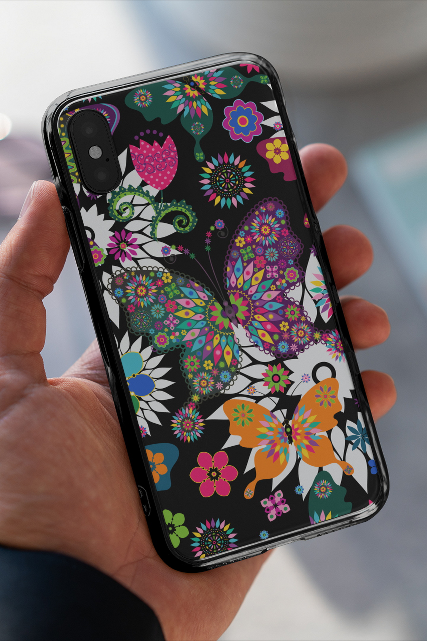 Vynikající ochranný obal pro mobilní telefony Apple iPhone, Samsung Galaxy, Google Pixel a Motorola Edge. Obrázkový motiv květinové louky s motýly na černém podkladu.