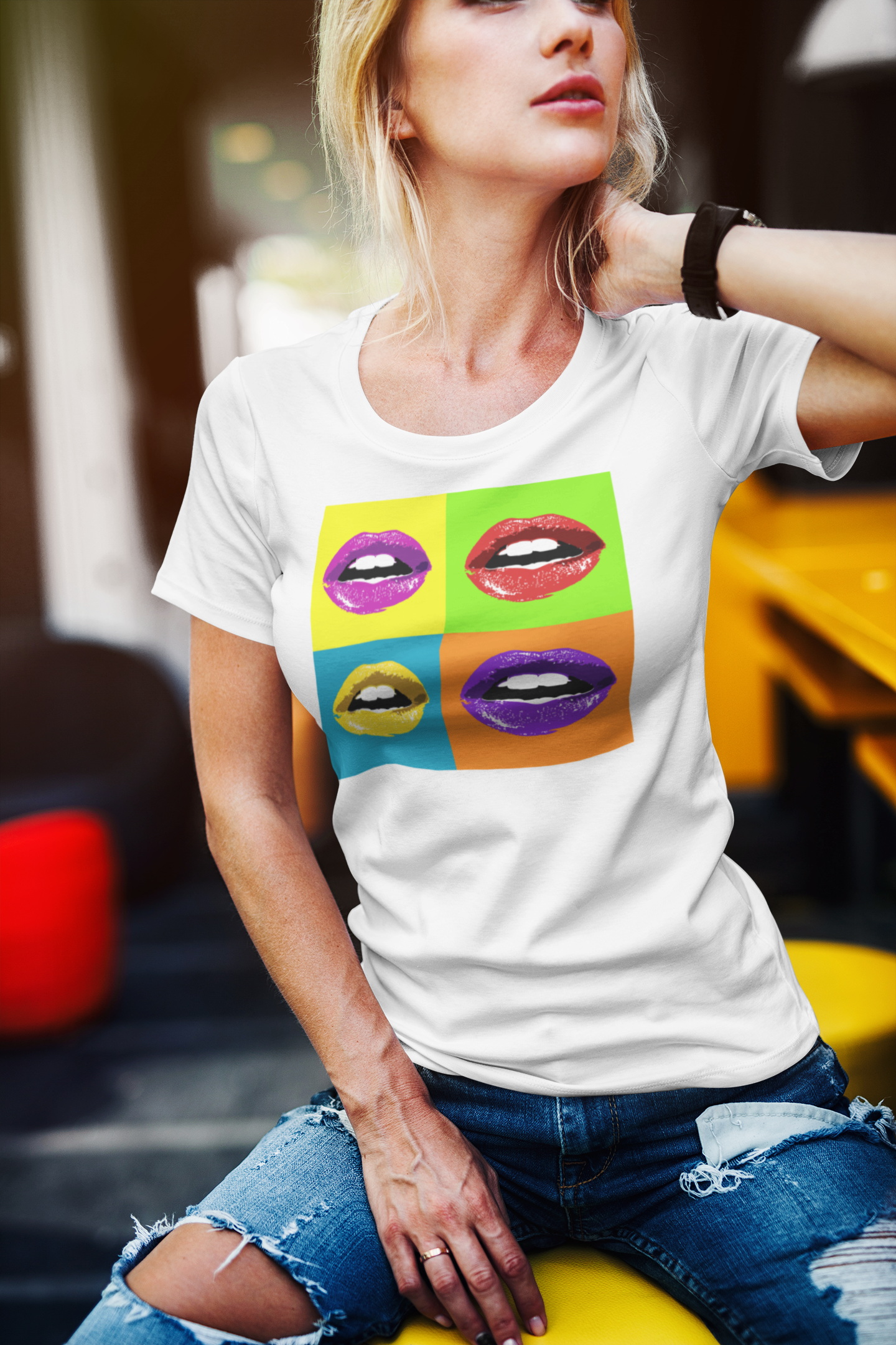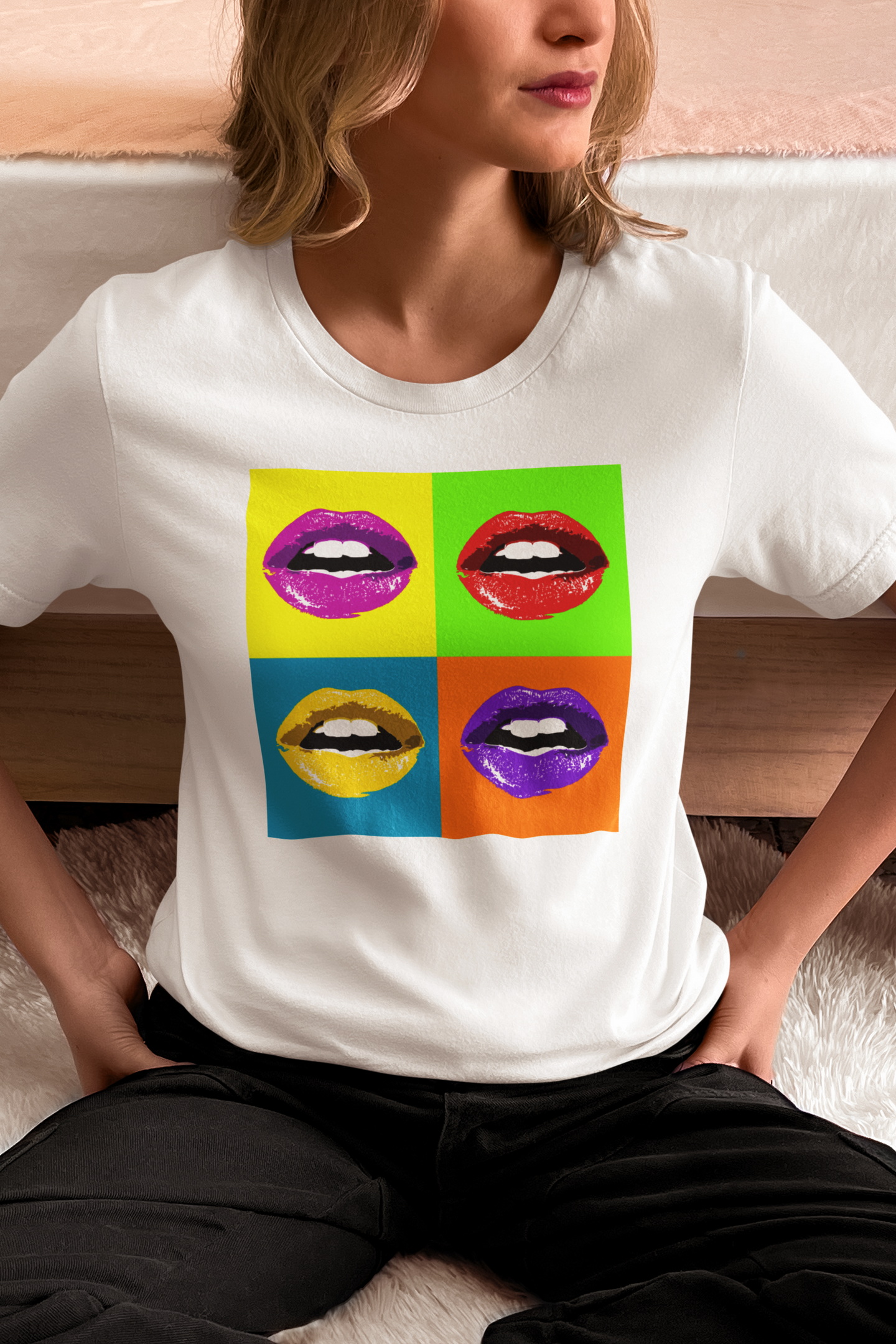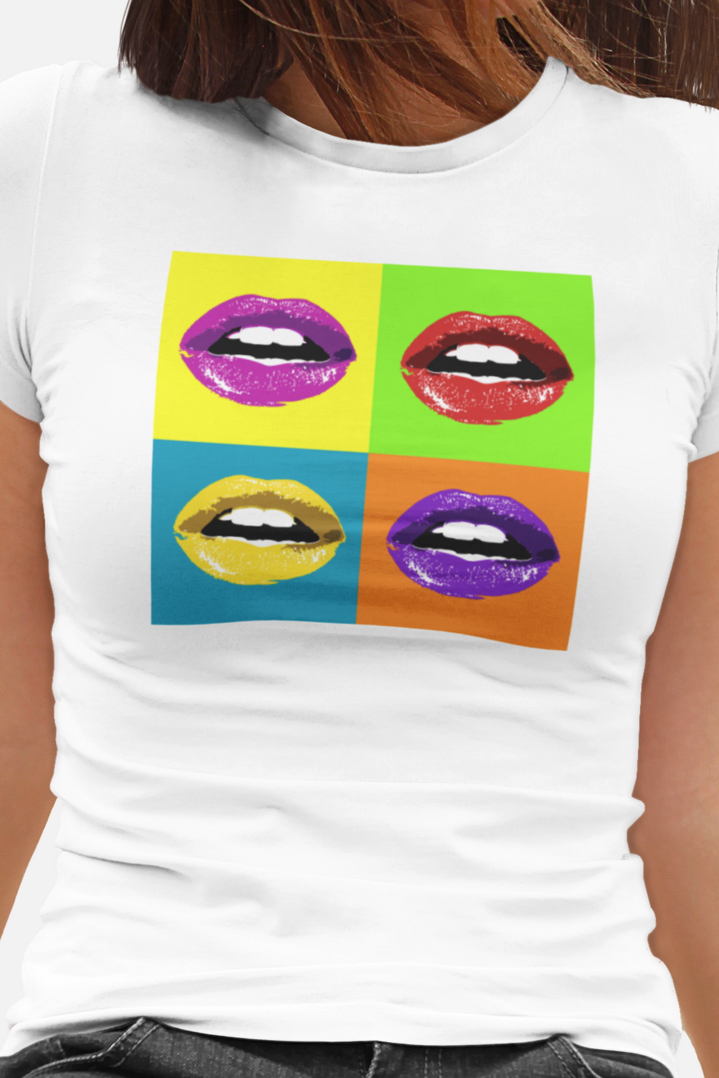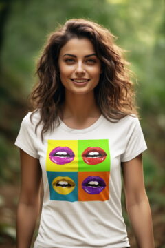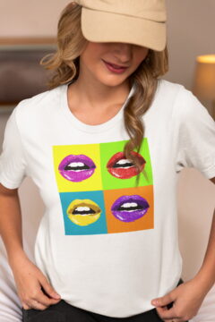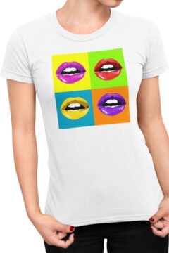 Dámské bavlněné tričko s potiskem. Motiv čtyř vášnivých rtů ve stylu Pop Art, připravených k polibku, inspiruje mnohé k rozdávání polibků. Vynikne také kvalitní digitální potisk a kvalita materiálu trička.