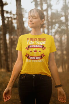 Vtipné dámské bavlněné tričko s tématikou vína a jógy.